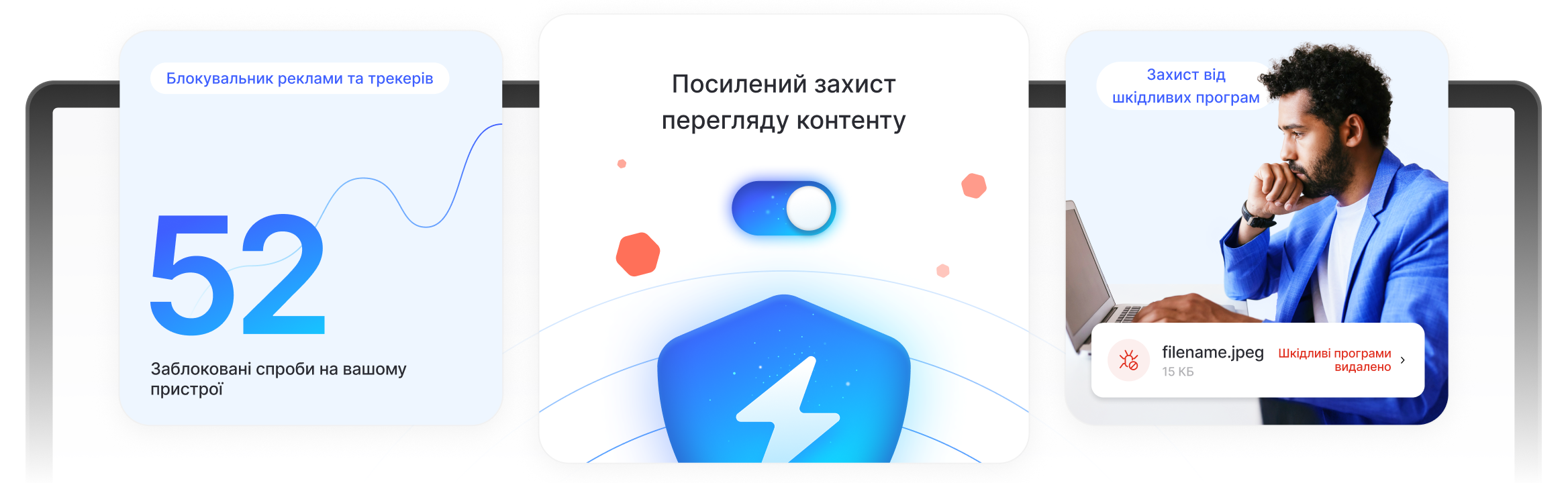Завдяки Threat Protection Pro™ ви можете безпечно й безперебійно переглядати контент без візуального засмічення. Блокуйте оголошення і трекери, які можуть відстежувати ваші дії в інтернеті та збирати дані про вас.